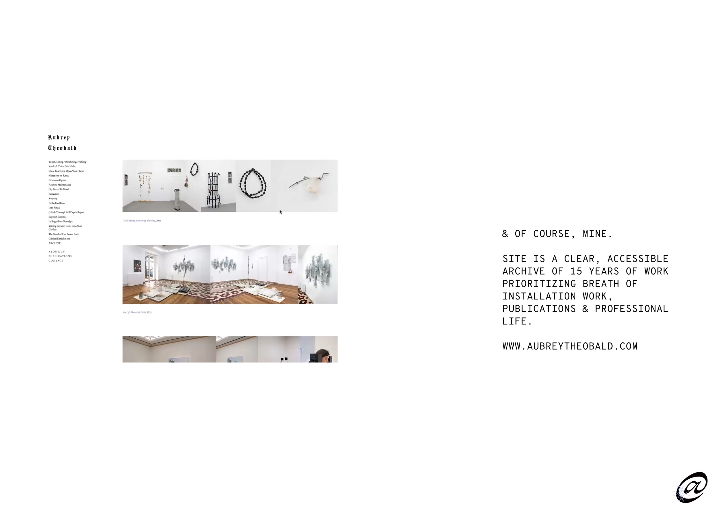 @Designs is the website and arts services design platform of Aubrey Theobald, an installation artist based in Berlin, Germany. Services range from artist portfolio websites, artist books and press materials to comprehensive brand and product design. AT(@)Designs is named after JRT Designs, Theobald’s father and lifelong teacher of graphic and industrial design